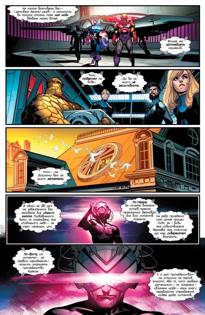 Такими словами Професор Х сповіщає людей Землі про появу нової мутантської держави Кракоа. Це безпечний притулок для всіх homo superior, зі своїми законами та мовою. В обмін на міжнародне визнання він запропонує людству великий науковий прогрес, заснований на унікальній флорі Кракоа. Але час співіснування минув. Стара мрія померла — настав час для нової. І наслідки дій Професора відчуватимуться через сто, навіть через тисячу років!